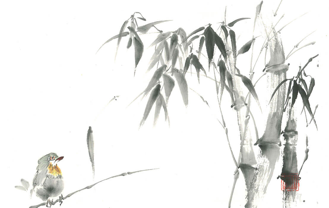 Ein kleiner Vogel sitzt aufmerksam auf einem dünnen Zweig vor einem kräftigen Bambusstamm; drei Blätter hängen herab und durchbrechen die weiße Leere des Hintergrunds.