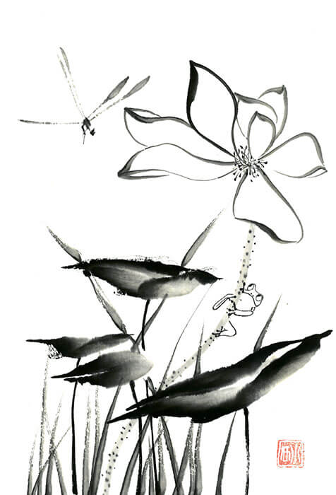 Zwischen Lotusblättern springt ein kleiner Frosch empor, eine Libelle fliegt leicht darüber – bewegte Stille in Schwarzweiß.