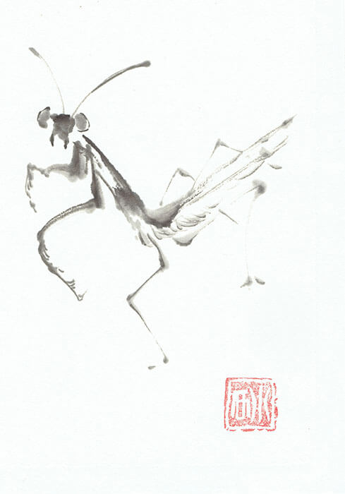 Eine filigrane Gottesanbeterin in gespannter Haltung – Sumi-e-Tuschemalerei mit klarer Linie von Nathalie Guski.