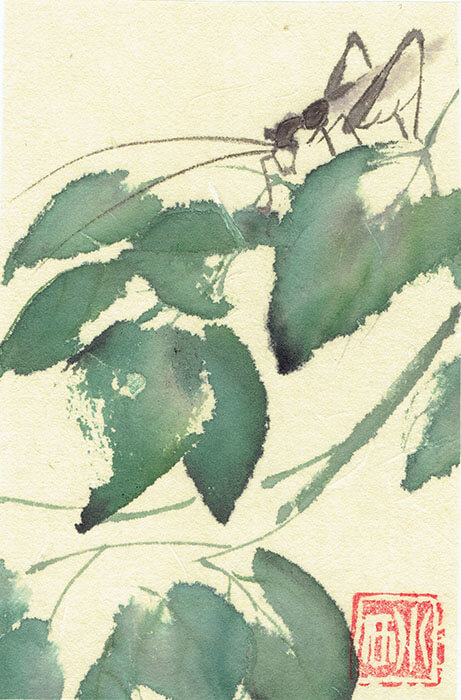 Eine fein gezeichnete Heuschrecke mit langen Fühlern sitzt auf saftig grünen Blättern – feine Beobachtung der Natur in Sumi-e-Technik von Nathalie Guski.