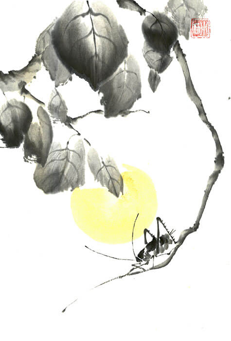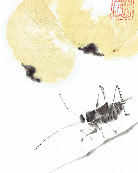 Eine Heuschrecke bei Vollmond auf Zweig – ein stiller Moment in reduzierter Sumi-e-Malerei von Nathalie Guski.