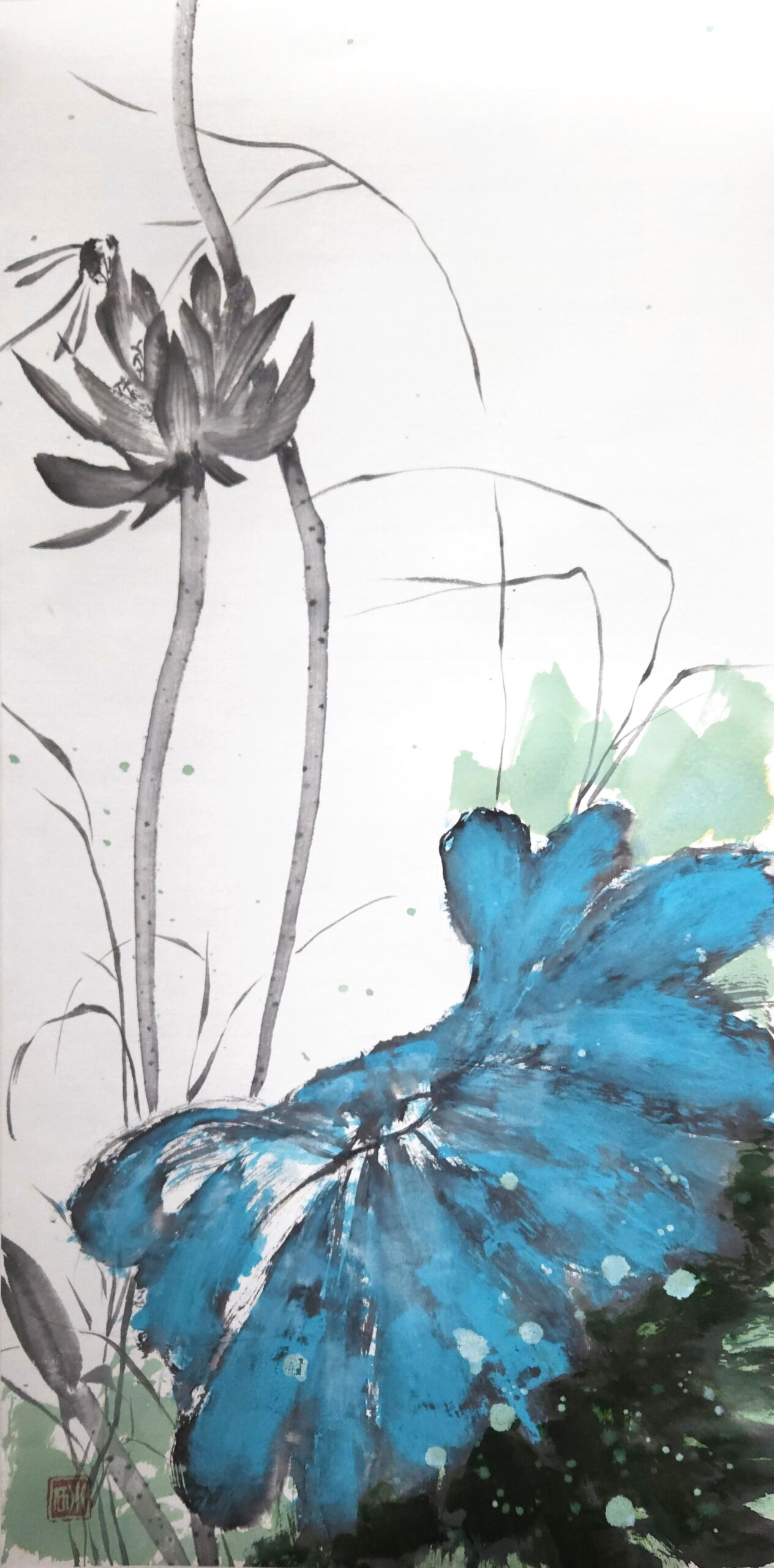 Eine feine Heuschrecke balanciert auf einem zarten Zweig unter großen, grauen Blättern. Die Tusche ist sparsam eingesetzt, der weiße Hintergrund lässt die Komposition atmen.